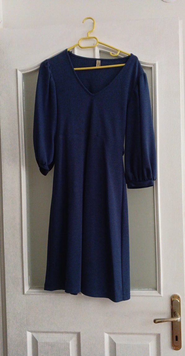 Lacivert renkli, V yakalı ve uzun kollu triko elbise. Salaş kesimi ve drapeli tasarımıyla midi boyda, yumuşak ve sıcak bir kumaştan yapılmıştır.