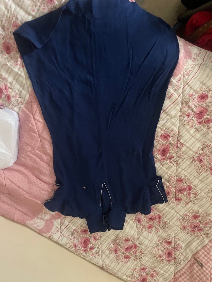 Lacivert renkte, v yakalı ve kolsuz uzun tulum, vücuda oturan ve dökümlü tasarıma sahiptir. Sentetik kumaştan üretilmiştir.