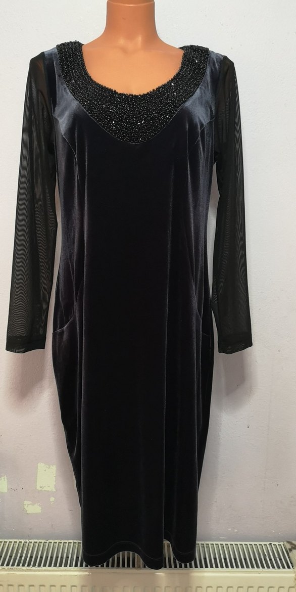 Lacivert uzun kollu, V yakalı ve drapeli tasarıma sahip gotik tarzda, düz kesim kadife elbise. Kolları şifon boyu 106cm iki kol arası 53cm 42.44 bedene