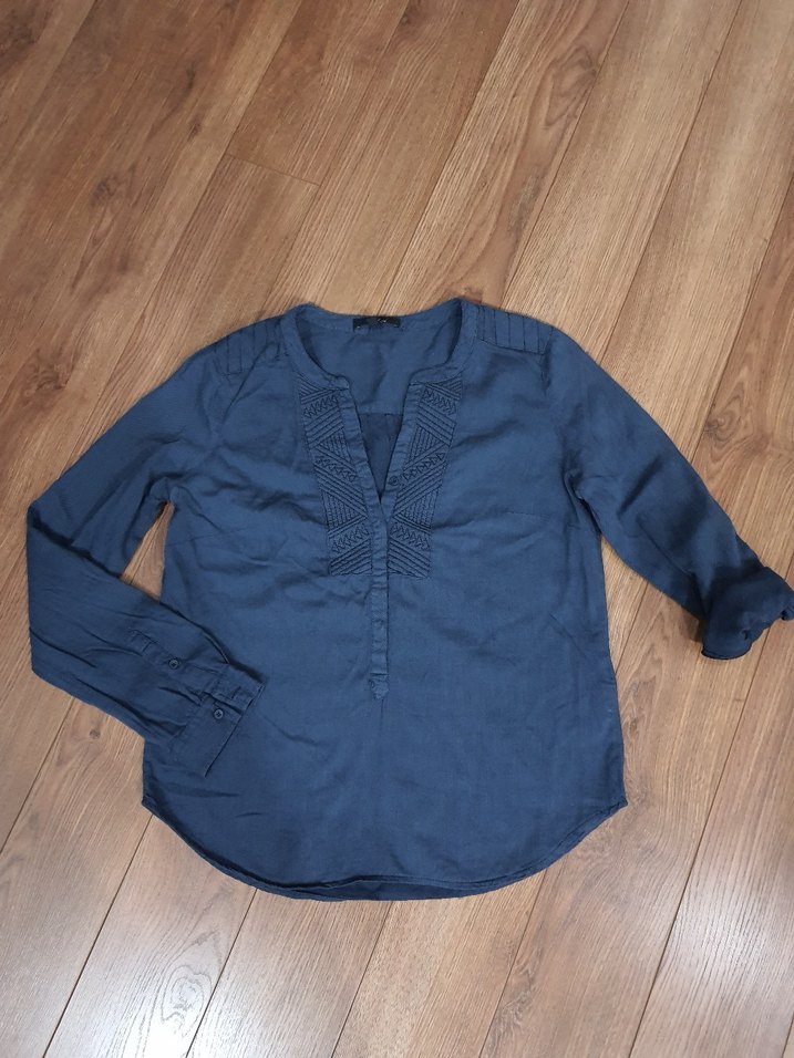 Lacivert keten kumaştan, V yaka ve düğmeli detaylı, normal kesim uzun kollu gömlek. Günlük rahat bohem tarz için uygundur. sadece bir kez giyildi ve yıkanmıştir