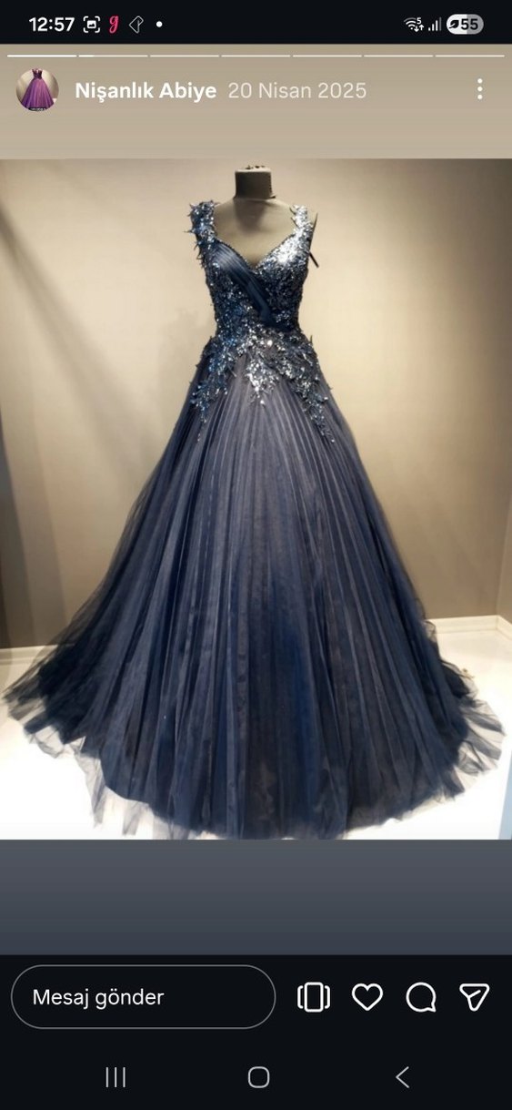 Kolsuz, V yakalı lacivert abiye, piliseli uzun etek ve desenli detaylarla klasik zarafet ve gotik tarzı bir araya getirir. ikinci el