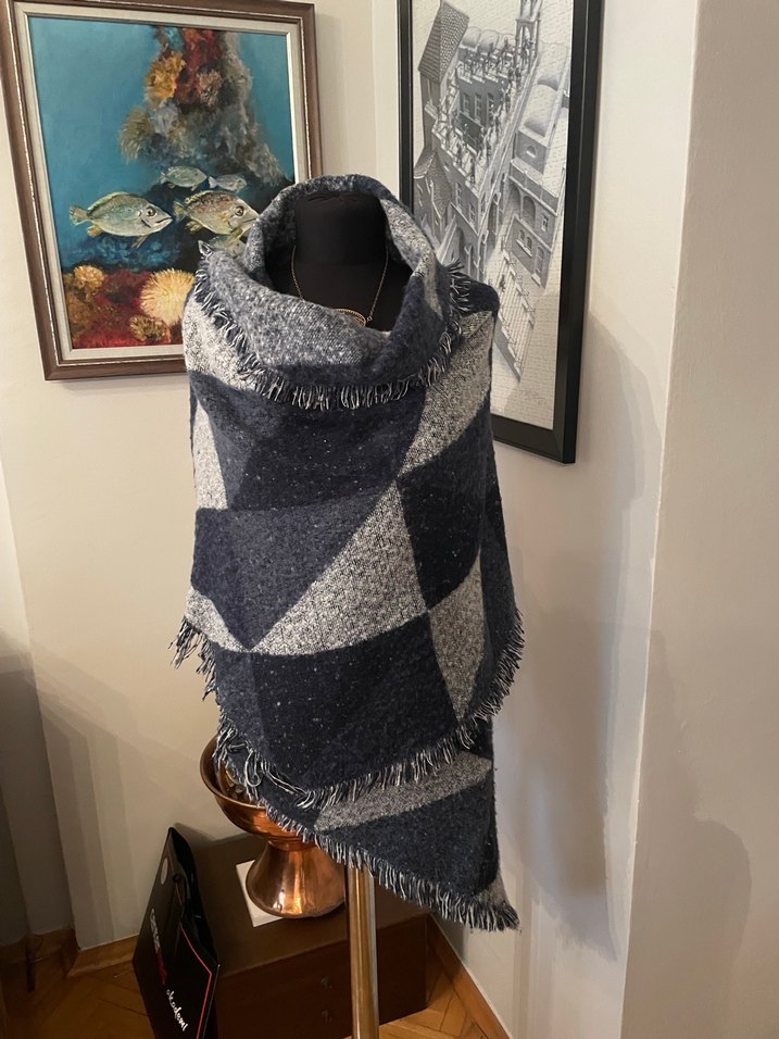 Lacivert ve açık gri renklerdedir genişlik 70 santim uzunluk 220 santimdir asimetrik kesimlidir. Kumaş bitimleri kendiliğinden püsküllüdür. ithaldir. #ŞAL #yün #kışlık #aksesuar #çok renkli #Asimetrik