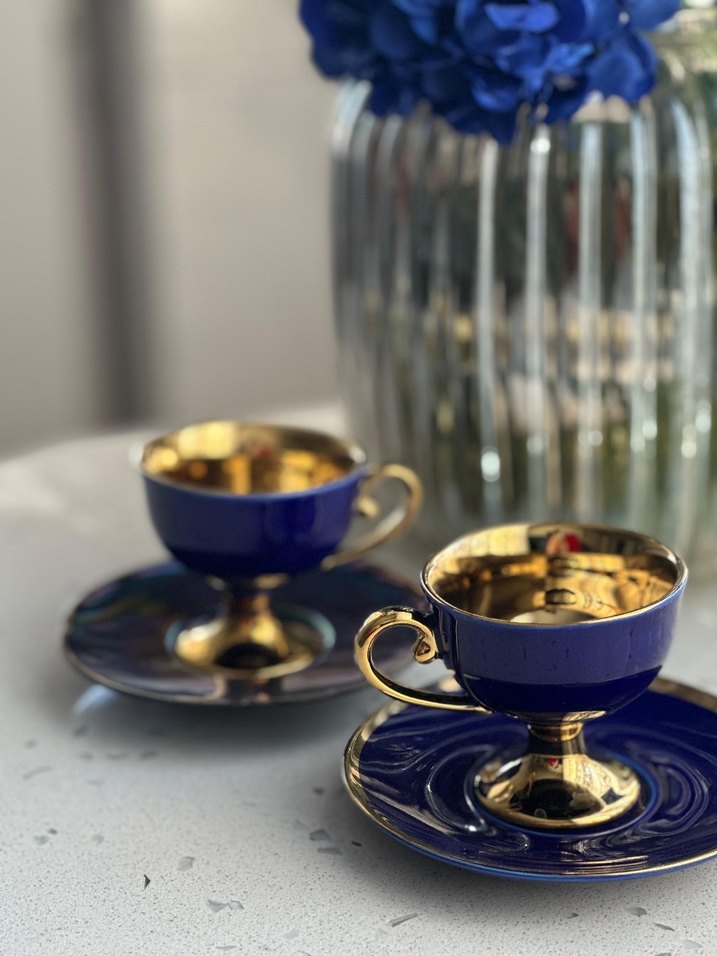 Lacivert kahve fincanları altın iç ve kulp detaylarıyla, uyumlu tabaklarla birlikte sunulur. Şık kahve sunumu için idealdir. ☕acar marka 6 kişilik fincan