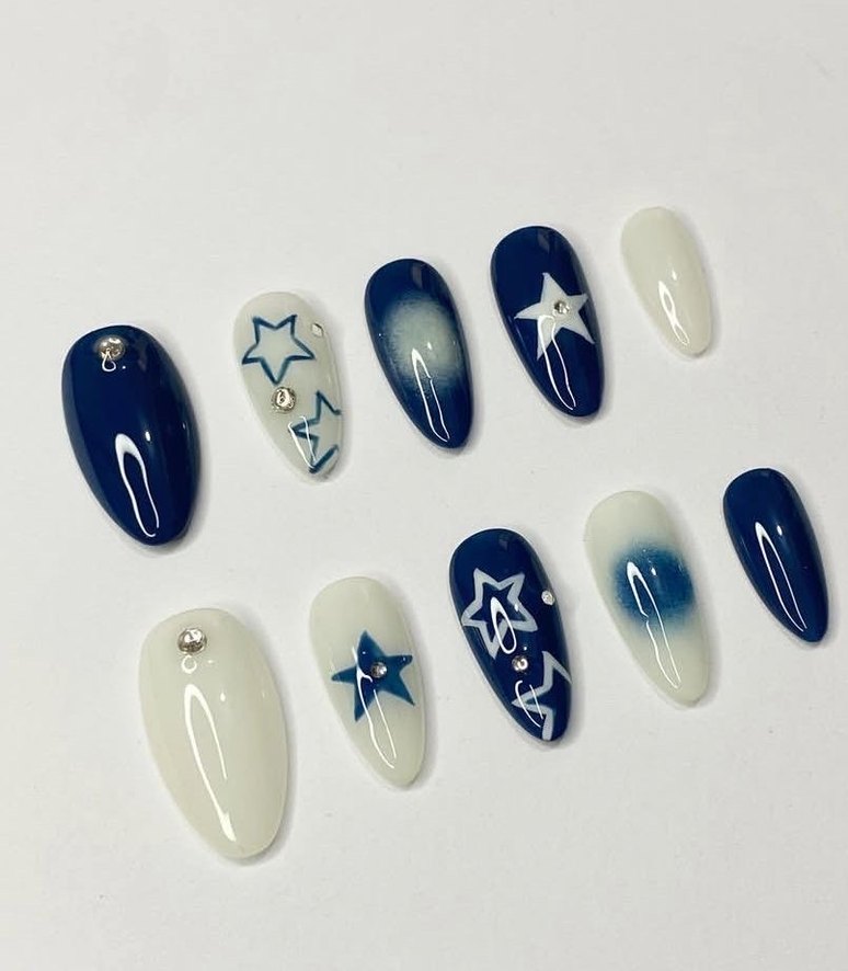 Lacivert ve beyaz renklerde, yıldız desenleri ve küçük taşlarla süslenmiş tırnak süsleri seti. Ürünün içinde törpü+yapıştırıcı+tırnak eti itici hediye