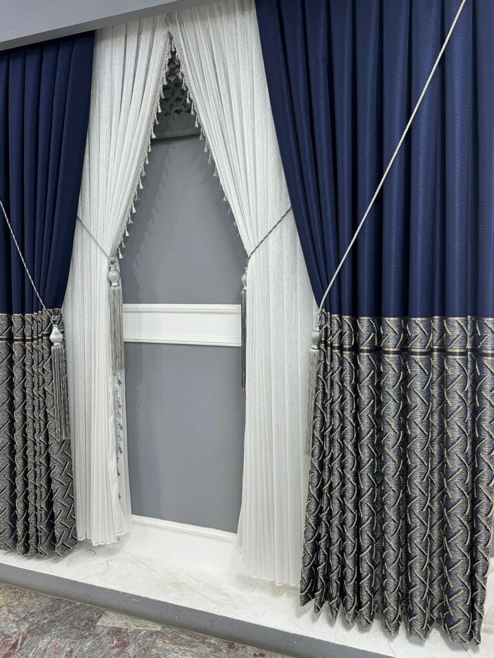 Lacivert ve gri işlemeli detaylara sahip modern klasik tarzda perde. Katmanlı tasarım ve şık işlemelerle tamamlanmıştır 2 adet aksesuar hediye