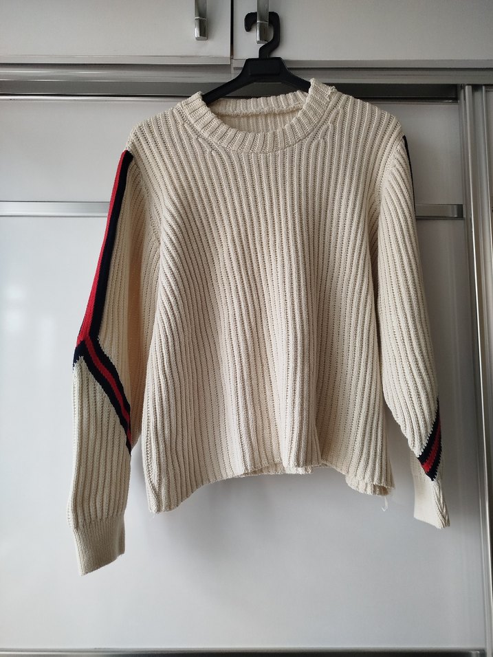 rahat kesimli, uzun kollu ve bisiklet yaka triko kazak. Günlük kullanım için uygun, kollarında ince şerit detayları bulunur. Dolap hesabından almıştım üstümde duruşunu hiç beğenmediğim için satıyorum. Etiketi yok ama 44 beden kalıbındadır.
