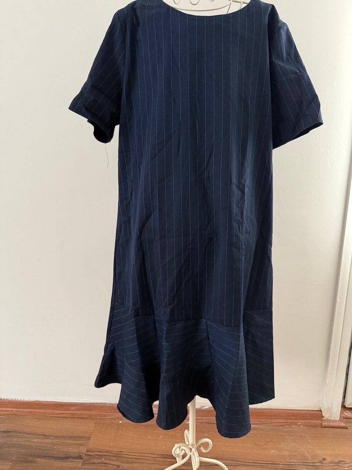 Lacivert ofis elbisesi, kısa kollu, yuvarlak yakalı ve rahat kesimdir. Yumuşak keten kumaştan, pilili ve sade tarzındadır.
