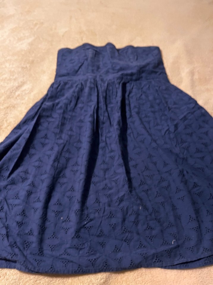 Lacivert renkte, bol kesim ve volan straplez elbise. Yumuşak dokulu kumaştan, bohem tarzda, romantik akşamlar için uygun.