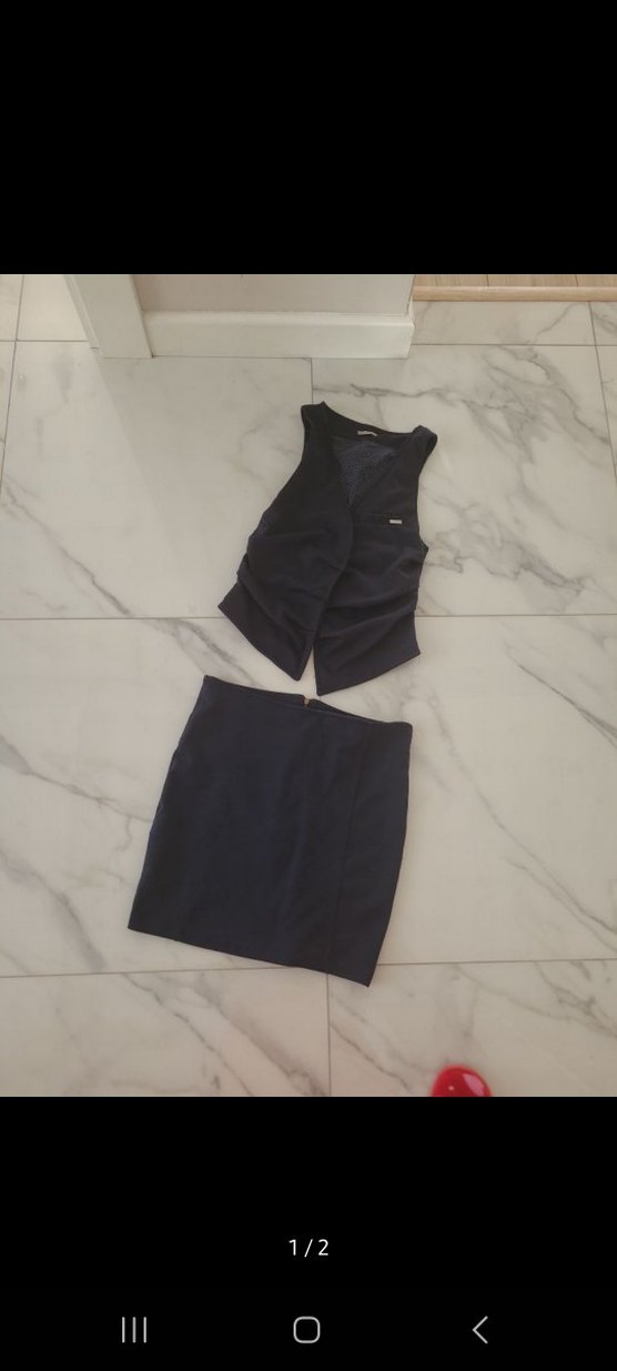lacivert, vücuda oturan mini etekve yelek takım, günlük kullanım için şık ve sade bir görünüm sunar. Trendy casual ve iş normcore tarzına uygundur.