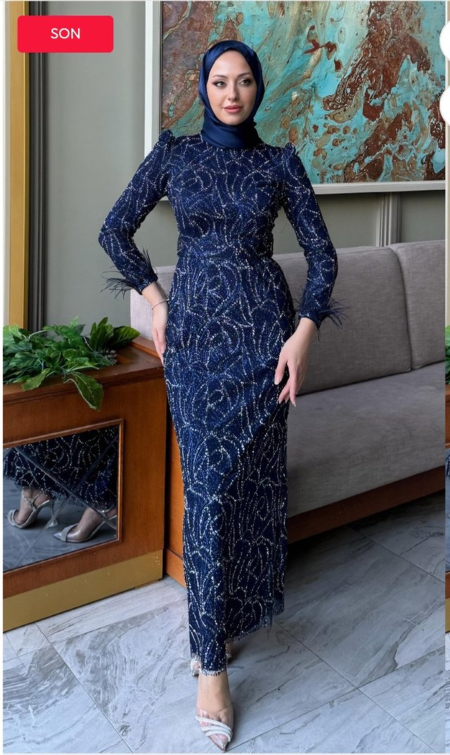 Lacivert yılan desenli, drapeli uzun abiye elbise, uzun kollu ve V yaka detaylı, ofis için uygun, şık ve mütevazı tarzda. 1 kere kullanıldı