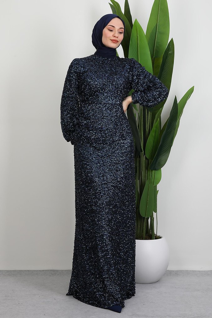 Lacivert yılan desenli uzun abiye elbise, yüksek yaka ve uzun kollu. Drapeli tasarımı ve düzenli kesimiyle ofis için uygun, gösterişli ve modest tarzda. sadece 1 kere giyildi