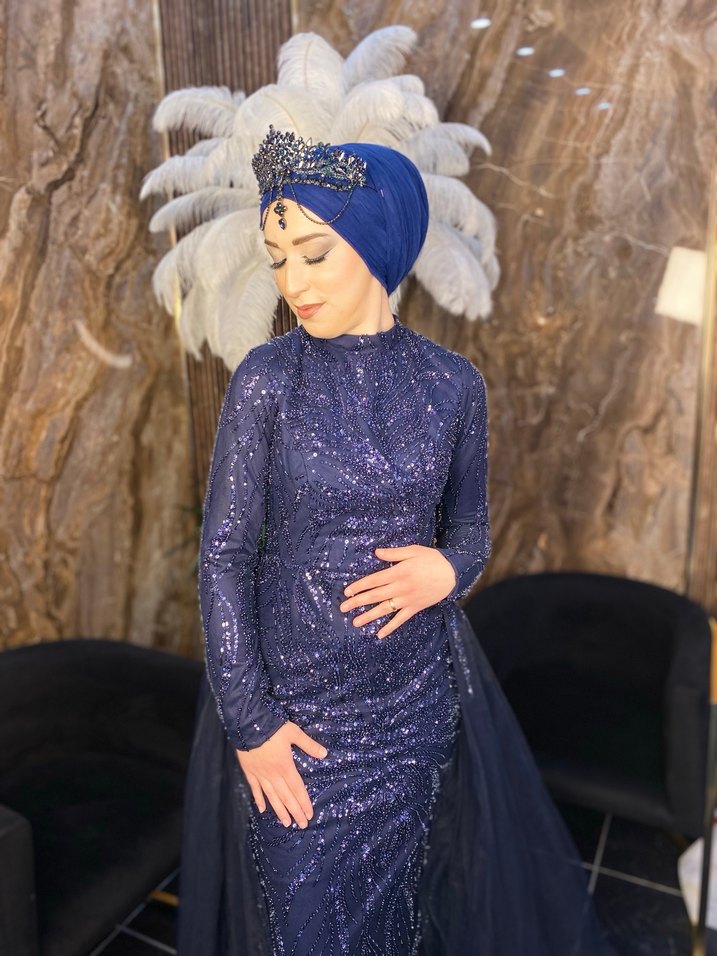 Lacivert yılan desenli uzun abiye elbise, yüksek yakalı ve uzun kollu, drapeli detaylarla zarif ve şık bir görünüm sunar. 36-38-40-42 Bedenlere uygundur Şalı dahildir