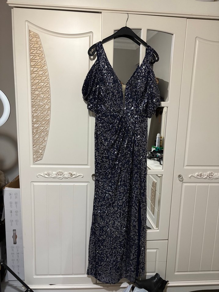 Lacivert yılan desenli, uzun ve drapeli abiye elbise. V yaka ve kolsuz, fit kesimiyle çağdaş bir şıklık sunar, partiler için uygun. ✨