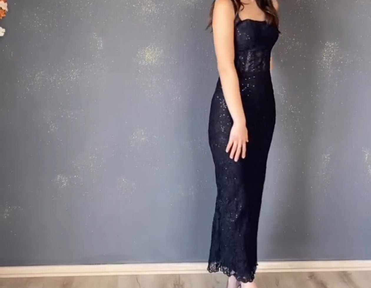 lacivert yılan desenli, uzun ve v yaka gece elbisesi. İnce askılı ve drapeli, cesur bir görünüm için uygundur.