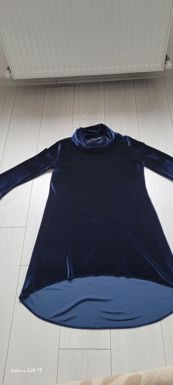 Lacivert renkte, yumuşak ve sıcak kumaştan yapılmış, yüksek yakalı ve uzun kollu, Dökümlü tasarımı ve uzun boyu ile gotik tarzı yansıtıyor.
