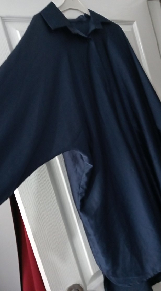 Lacivert renkli, satenimsi kumaştan yapılmış, drapeli, uzun kollu, yüksek yakalı ve bol kesimli Minimalist tarzda, günlük kullanıma uygun.