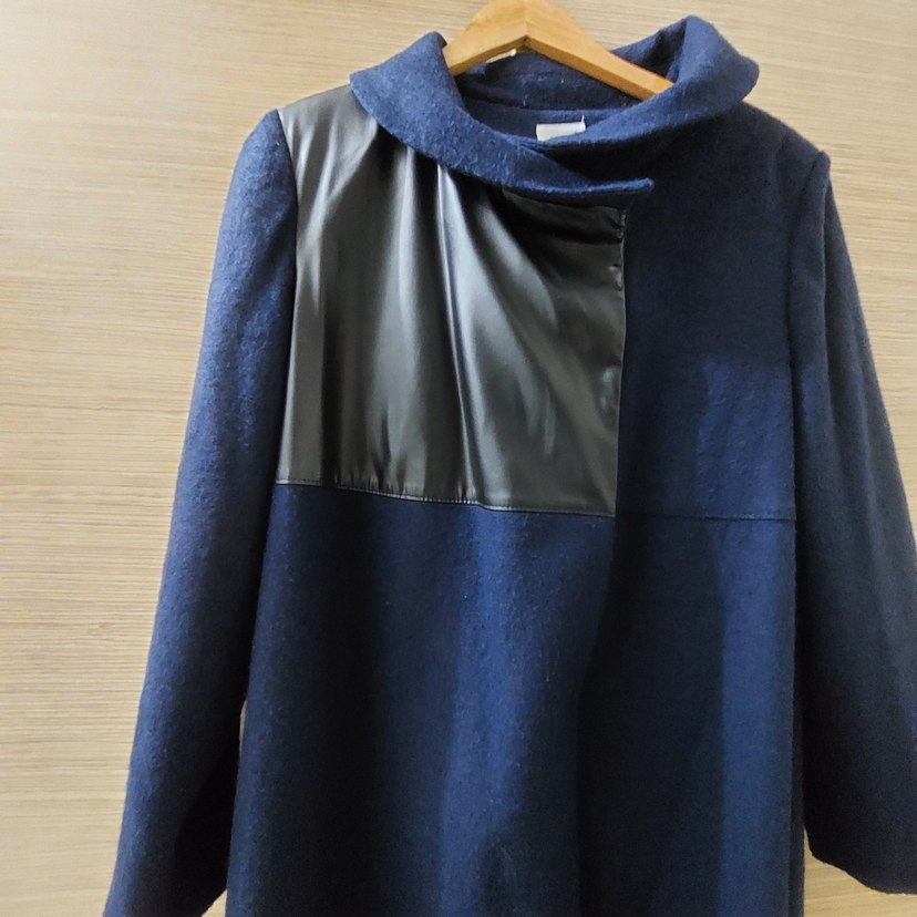 Lacivert renkte, yüksek yakalı ve uzun kollu, drapeli detaylı sentetik kumaştan yapılmış, çağdaş tarzda ve regular fit kabanı.