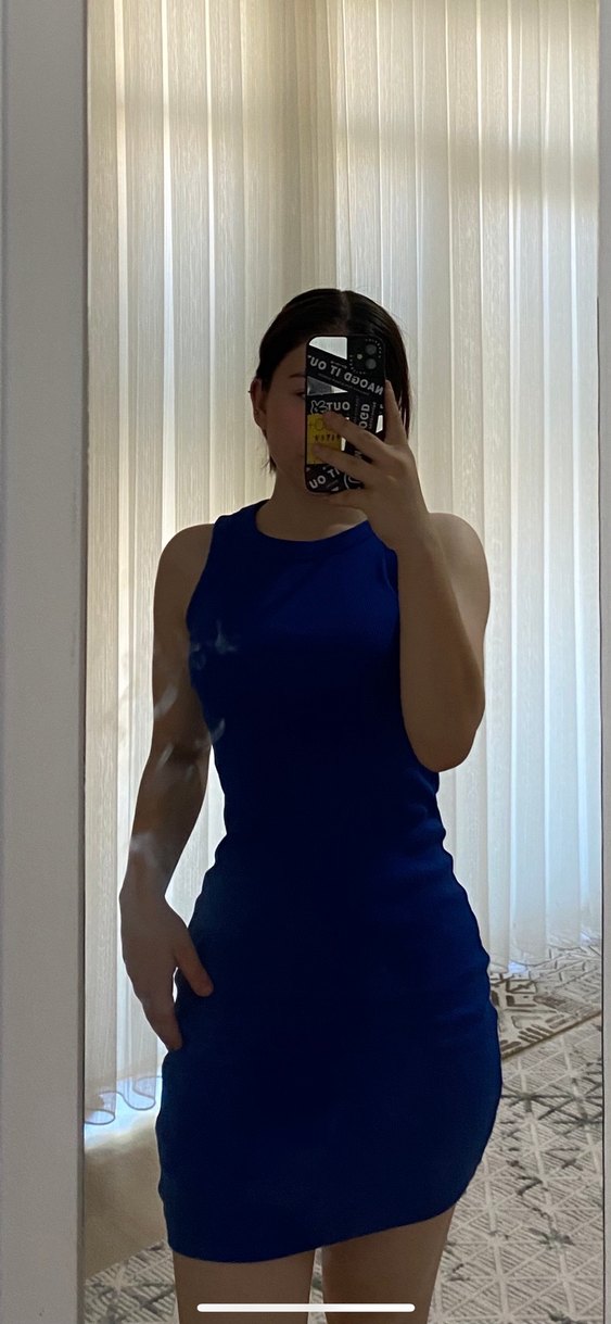 Lacivert renkte, yüksek yakalı ve kolsuz mini elbise. Düz ve sentetik kumaştan, günlük kullanıma uygun, sade ve şık bir tasarım.