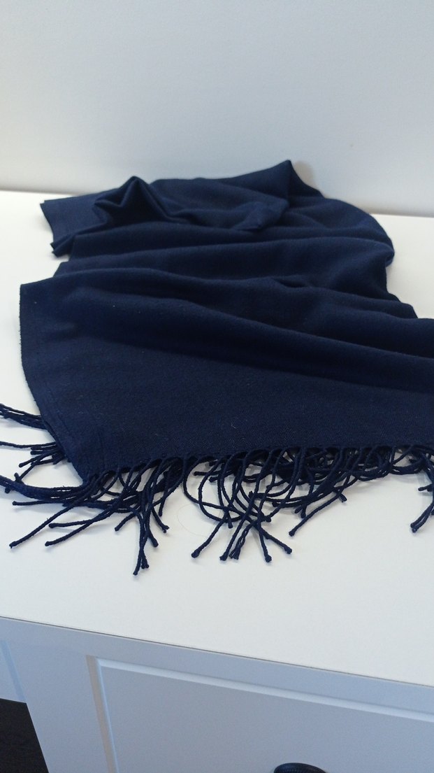 Lacivert yünden yapılmış, püsküllü, sade ve bohem tarzda sıcak tutan şal. Rahat ve şık bir görünüm sağlar.