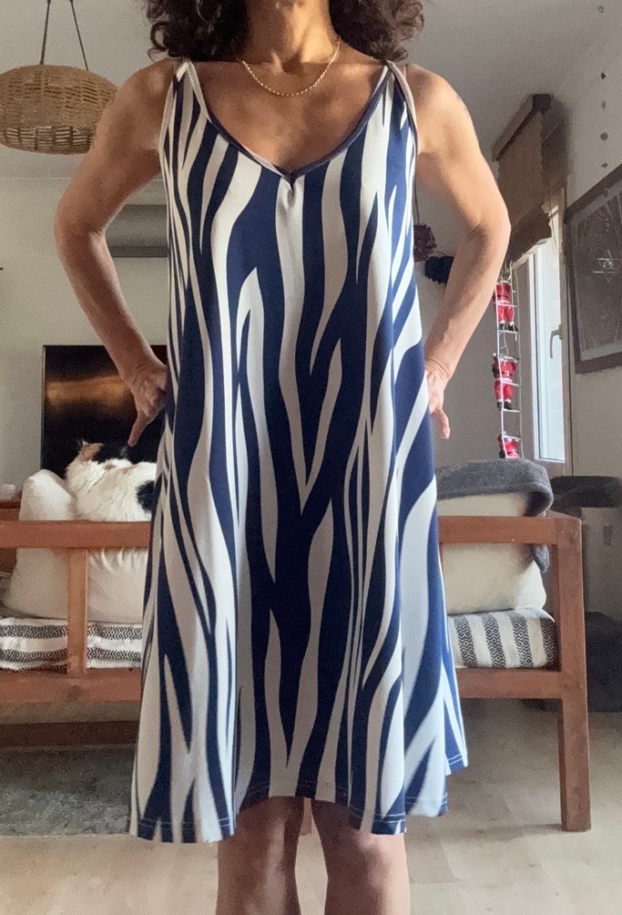 V yaka, kolsuz, bol kesim, dizüstü yazlık elbise, mavi ve beyaz zebra desenlidir.