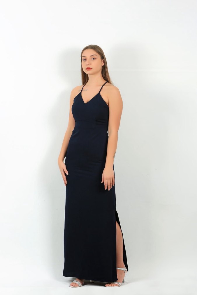 Lacivert uzun elbise, v yakalı ve ince ip askılı tasarımı, yırtmaç detayıyla şık ve sade görünüm sunar.
