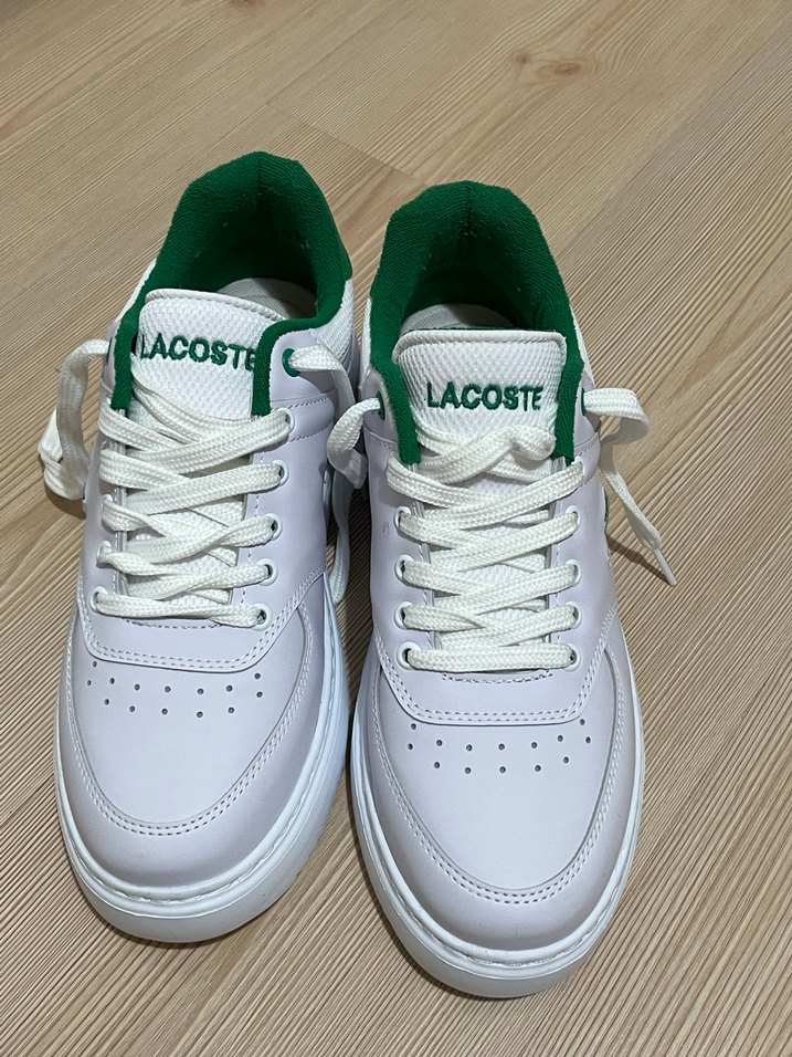 Orijinal Lacoste marka beyaz bağcıklı spor ayakkabısı, hafif ve desensiz tasarımıyla günlük spor ve sokak stiline uygundur.