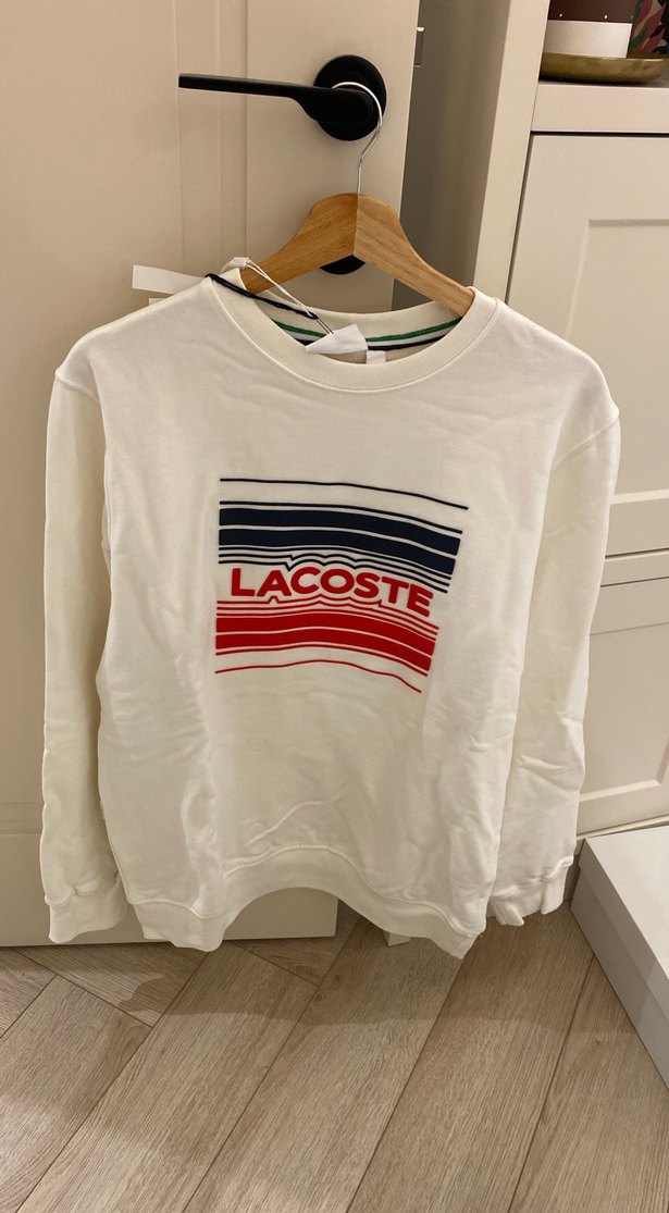 Lacoste orijinal marka, pamuk kumaştan beyaz erkek sweatshirt. Uzun kollu, yuvarlak yakalı ve baskılı desene sahip, rahat kesimdir. Hiç giyilmedi.