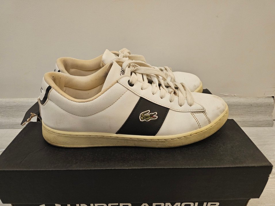 Lacoste markalı, beyaz bağcıklı erkek spor ayakkabısıdır. Kauçuk malzemeden üretilmiş, düz tabanlı ve siyah yan paneliyle klasik görünüme sahiptir. alt tarafı sararmistir. uygun fiyata verilecektir
