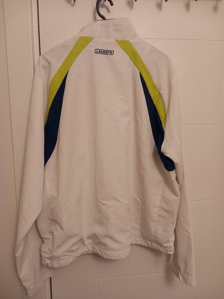 Lacoste marka, beyaz ve gri tonlarda, sentetik kumaştan yapılmış, fermuarlı, uzun kollu, bol kesim erkek spor yağmurluğudur.