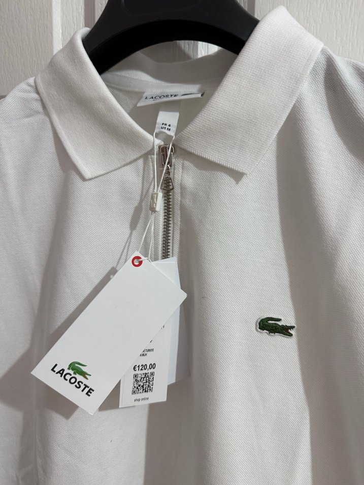 Lacoste beyaz fermuarlı erkek polo tişört, pamuklu ve bol kesimdir. Kısa kollu, baskılı ve günlük rahat stil için uygundur. Fiyatı €120,00.