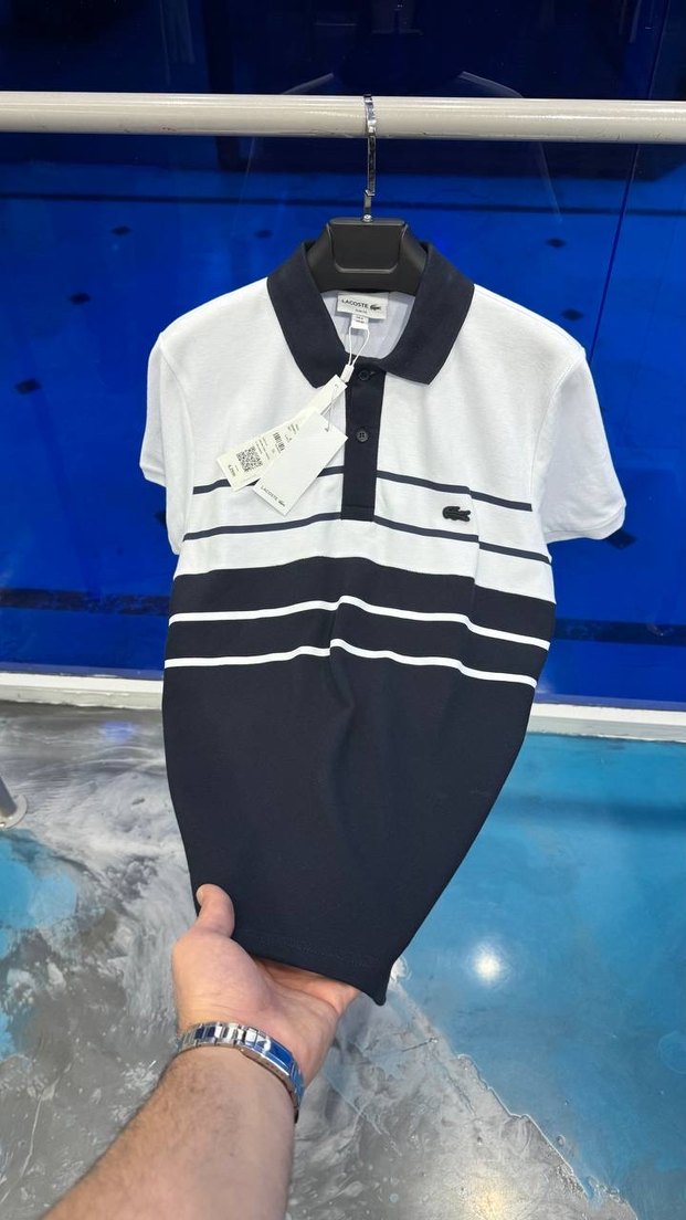 Lacoste marka erkek polo tişört, kısa kollu, yakalı ve regular fit. Beyaz ve gri renkli, çizgili baskılı tasarım ve cırt cırtlı detay içerir. Günlük kullanıma uygundur.
