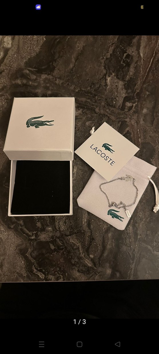 Lacoste markalı, beyaz kadın bileklik gümüş. Koyu baskılı deseniyle klasik zarafeti günlük sokak stiline taşır. Kutusu ve kesesiyle birlikte.