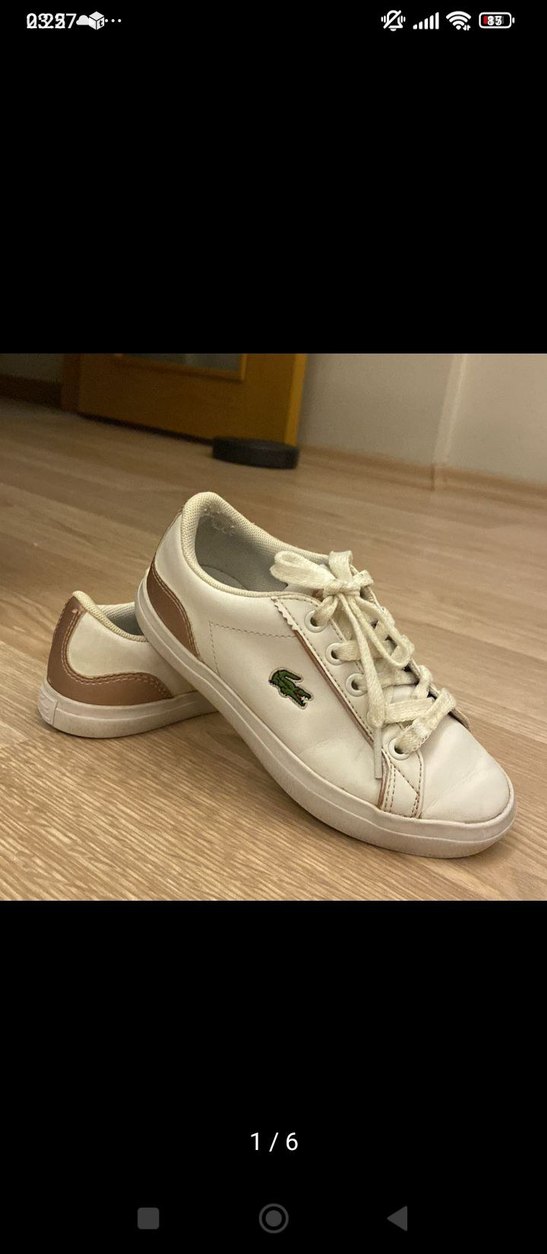 Lacoste markasının bağcıklı, beyaz renkli ve kauçuk tabanlı kız çocuk sneaker modeli, sade ve şık sokak stili için uygun. ️