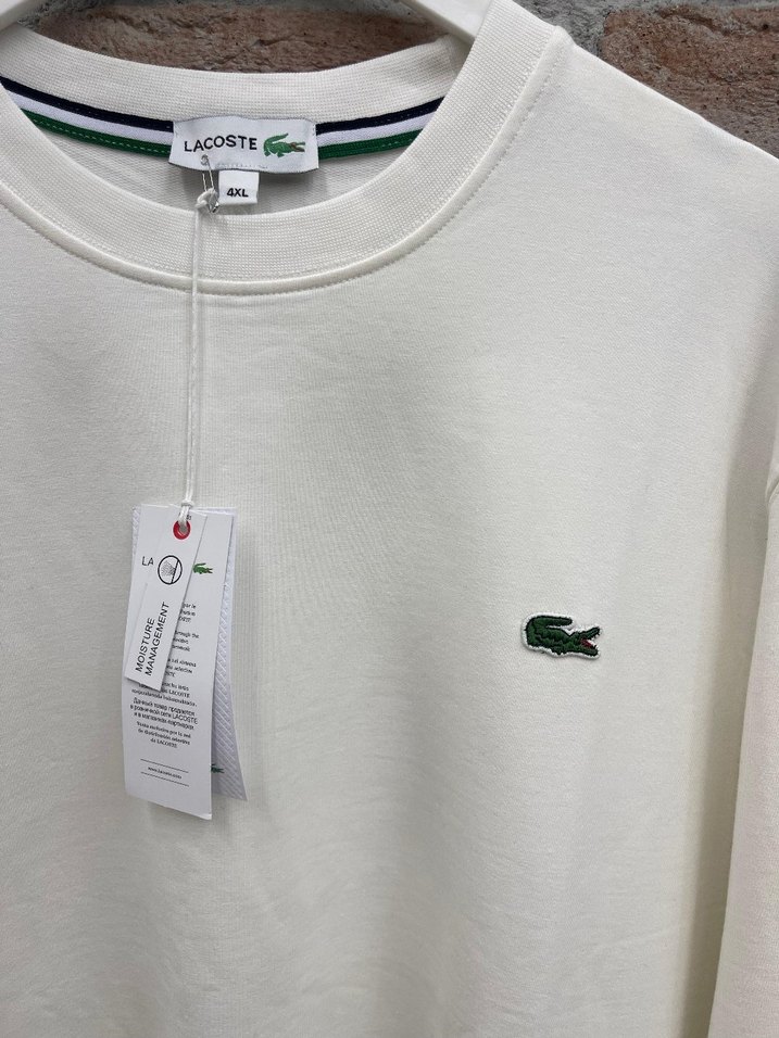 Beyaz Lacoste sweatshirt, pamuklu kumaştan, yuvarlak yaka ve uzun kollu. Bol kesim ve baskılı timsah logosu ile rahat ve şık bir günlük parça.