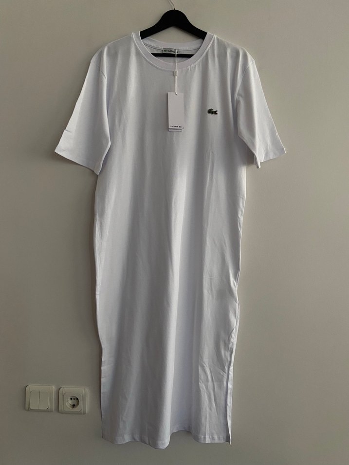 Lacoste beyaz kısa kollu yüzde 100 pamuklu kumaştan, orijinal salaş kesim, kısa kollu ve bisiklet yaka tasarıma sahip minimalist ve rahat uzun elbise. Yeni ve etiketli bir üründür iç ve dış etiketi mevcuttur ürün standart bedendir M-L giyinen danışanlarım tercih edebilirsiniz.