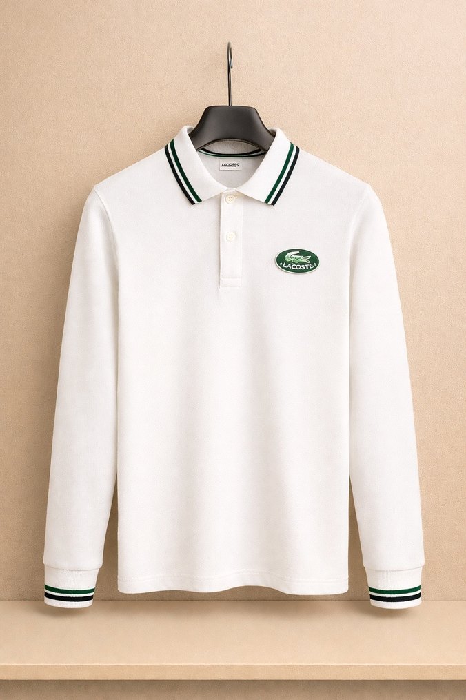 Lacoste markalı, düğmeli önü ve çizgili yakasıyla uzun kollu beyaz polo tişört. Yumuşak, sıcak kumaştan, rahat kesim ve günlük kullanım için uygundur.