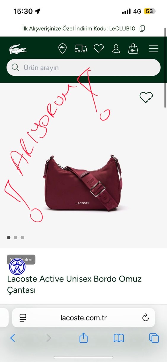 Lacoste markalı bordo omuz çantası, kemerli tasarımı ve sentetik kumaşıyla dikkat çekiyor. Günlük kullanım için şık ve sade bir seçenek.