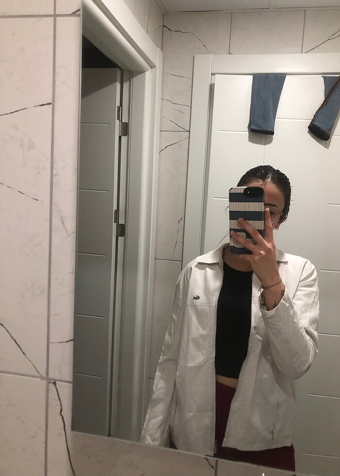 Orijinal üründür rengi kırık beyaz gibi iç astarında sadece yırtık var dış tarafta hiçbir kusuru yoktur sayılı giyildi tertemiz
