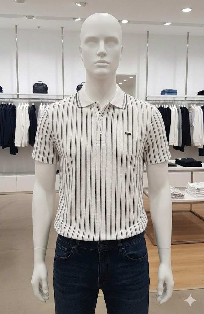 Lacoste'un beyaz zemin üzerinde siyah çizgili, kısa kollu, yakalı ve düğmeli pamuk erkek polo tişörtü. Rahat kesimli ve günlük sokak stili için uygun.