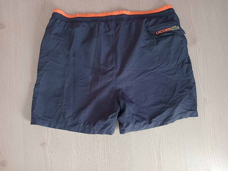Lacoste logosu ile düğmeli cepli, mavi renkli, bol kesim erkek mini mayo şort. Plaj ve sokak stili için uygundur.