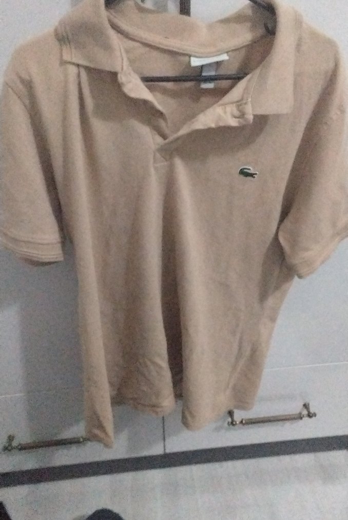 Bej renkli Lacoste erkek polo tişört, yakalı ve kısa kolludur. Yumuşak keten kumaştan üretilmiş, rahat ve bol kesimdir.