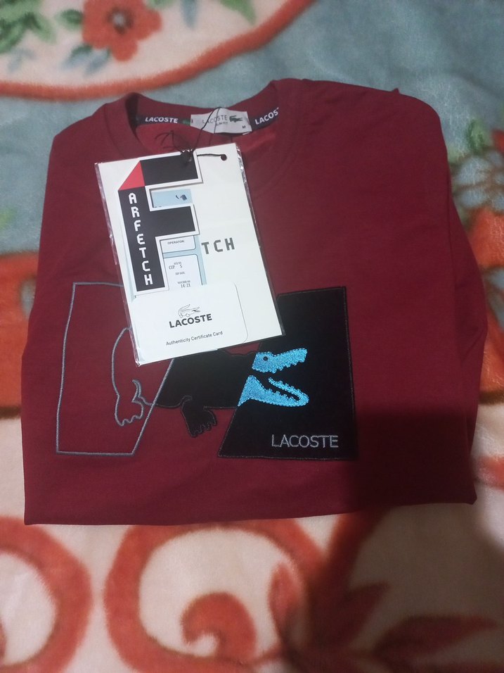 Lacoste markalı, baskılı desenli, kırmızı renkli, uzun kollu ve fitted kesim erkek tişörtü. Sentetik kumaştan, günlük sokak stiline uygun. sıfır etiketli ithal Ürün.