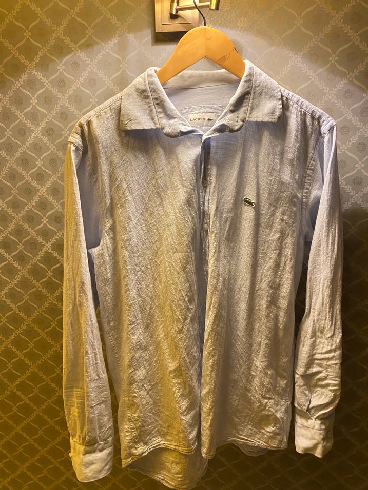 Lacoste erkek Buz Mavisi keten gömlek, düğmeli, uzun kollu ve yakalıdır. Rahat kesimi ve normal boyuyla günlük sokak stiline uygundur.