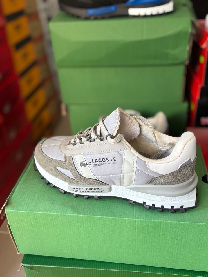 Lacoste erkek spor ayakkabısı beyaz ve gri renklerde, baskılı desenli, bağcıklı ve kauçuk tabanlıdır.