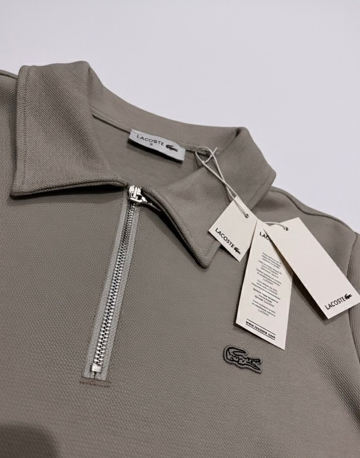 Lacoste markalı gri erkek sweatshirt, fermuarlı polo yaka ve göğüste ikonik logo ile sade ve modern tarz sunar.