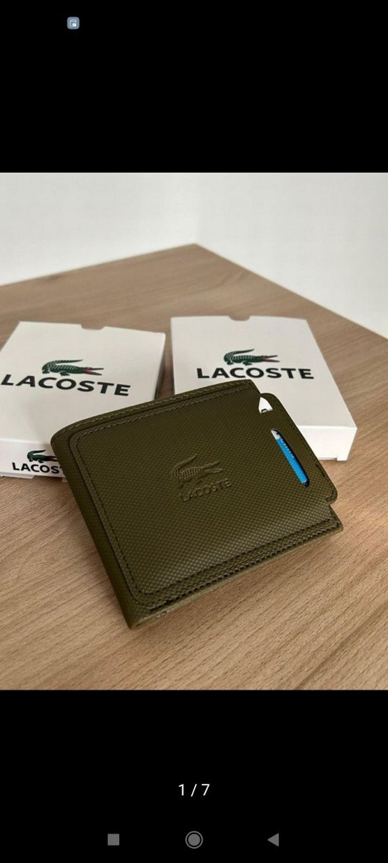 Lacoste marka haki renk erkek cüzdan, baskılı dokusu ve mavi detayıyla iş ve sokak modasını birleştiriyor.