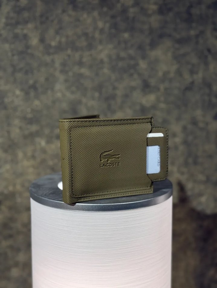 Lacoste erkek cüzdanı, haki renkte ve minimal baskılı desene sahiptir. Sokak stilini yansıtan sade görünümü ve kart için ayrılmış bölmesi vardır.