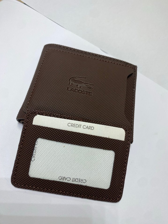 Lacoste marka kahverengi erkek cüzdan, baskılı dokusu ve kredi kartı yuvalarıyla basic, sokak stili ve iş tarzına uygun.