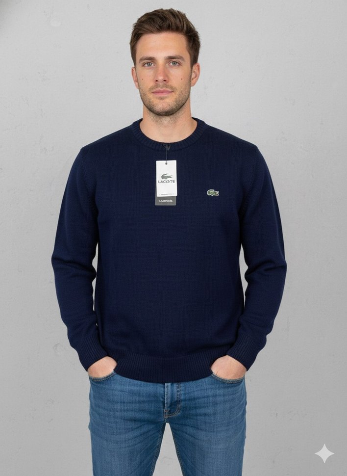 Lacoste erkek sweatshirt, lacivert örme kumaş, bisiklet yaka ve uzun kollu, rahat kesimle günlük sokak stili için uygundur.
