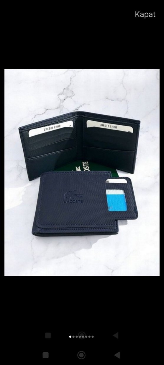 Lacoste marka, koyu lacivert renkte erkek deri cüzdan, çoklu kart yuvaları ve baskılı logo ile sade ve temel tasarıma sahiptir.